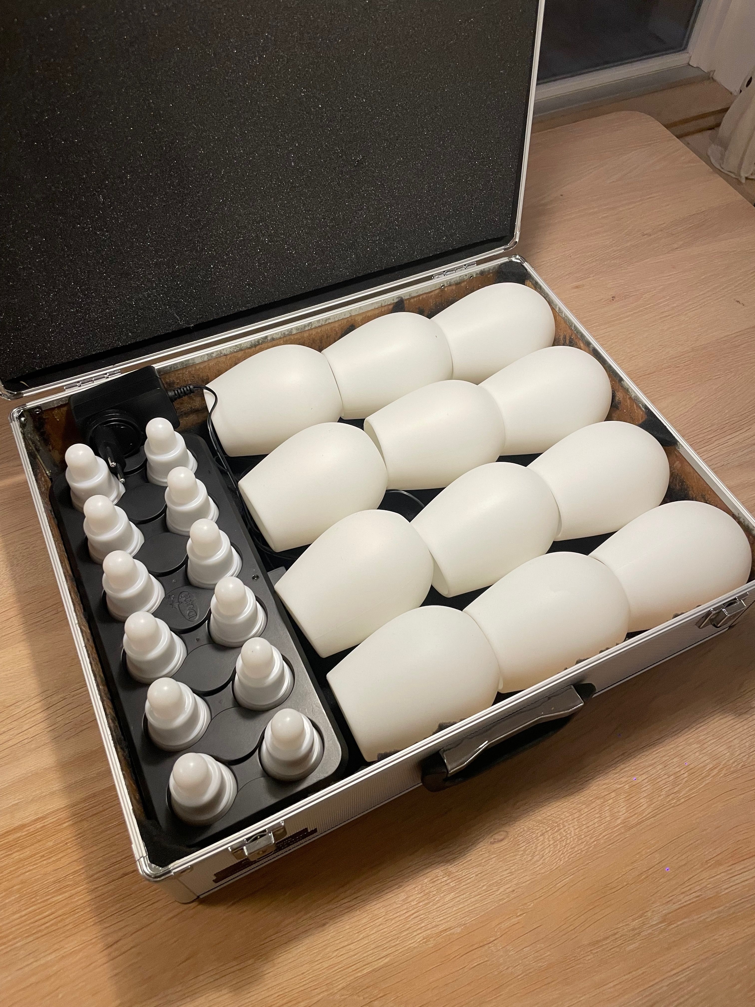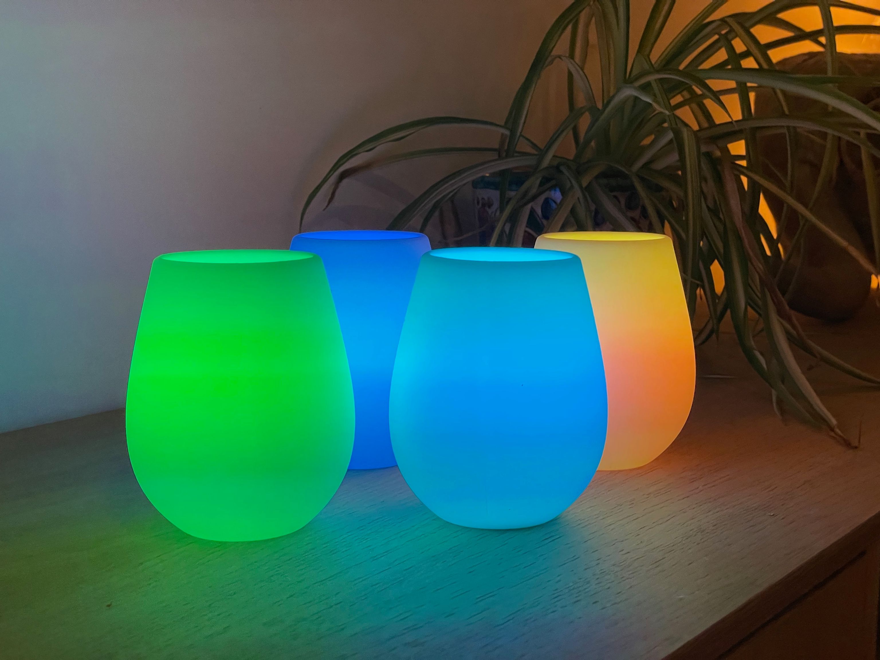 12 vandfaste LED bordlys med minimalistiske stager i silikone. Pæne nok til bryllup og robuste nok til at klare enhver fest. Lysene kan både simulere klassisk stearinlys og lyse i 12 forskellige farver.